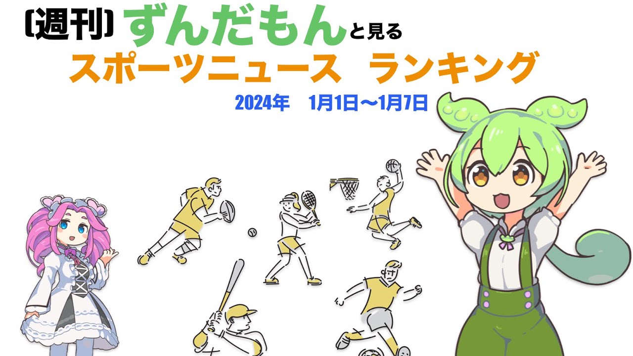 【週刊】ずんだもんスポーツニュースランキング 2024年1月1日ー1月7日【weekly】Zundamon’s sports news ranking in Japan スポーツ Twitter Facebook Hatena Bookmark Pocket LINE Copy 2025.07.12 日本の1週間のスポーツニュースを、ランキング形式でずんだもんと見ていく番組です。 政治や芸能ニュース等は扱わず、スポーツニュースのみを取り上げています。