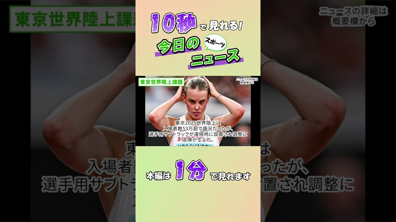 【スポーツニュース】東京世界陸上課題【9月22日】 スポーツ Twitter Facebook Hatena Bookmark Pocket LINE Copy 2026.01.05 #ニュース #東京2025世界陸上 #サブトラック ニュースの詳細はこちらからチェック! 東京世界陸上課題 https://news.yahoo.co.jp/articles/8cbc8a444a362bd78b0cb90a695e0e8adc33a39b メイン動画ではその他のニュースを1分でまとめていますのでぜひご覧ください。 *AI読み上げソフトを使用しているため、漢字の読み方を間違えている場合があります。ご了承ください。 VOICEVOX:四国めたん